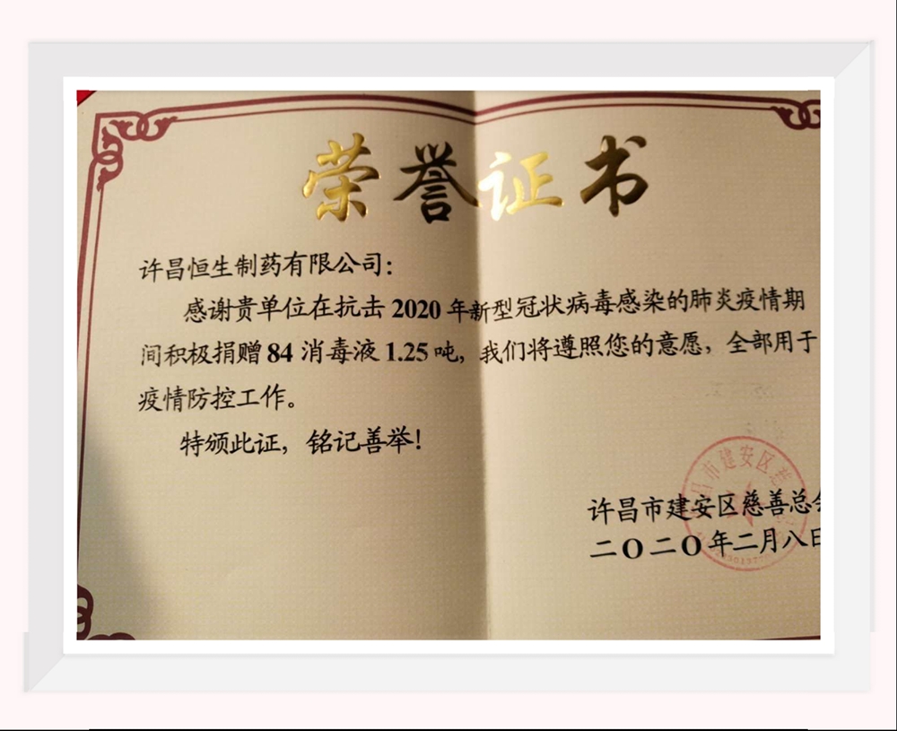 在得知相關防疫物資需求量不斷上升,各項物資處于緊缺的情況下,許昌恒生制藥有限公司第一時間通過許昌市建安區(qū)慈善總會捐贈84消毒液1.25噸,全部用于疫情防控工作。